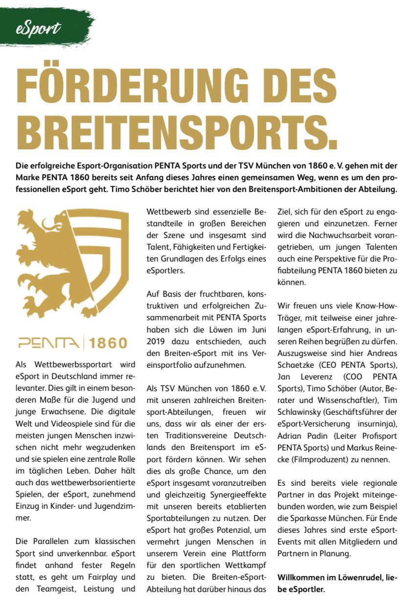 For example, I was allowed to report on e-sports for all in the Löwenmagazin of the traditional German club TSV 1860 Munich, which is one of the clubs with the most members in Germany and has many different sections for all kinds of sport.