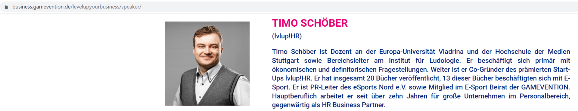 - Timo SchöberBorn 1983Abitur 2003Academic (best in major and minor in the diploma, summa cum laude in the doctorate)10 years of professional experience (HR), including 11 years as an employee in the HR Business Partner area of Krones AG including co-supervision of two subsidiaries and as HR Business partner of Stadtwerke FlensburgAuthor of 17 books, 9 of them on the subject of e-sportsCo-author of a further 8 e-sports booksAuthor of 2 textbooksAuthor/co-author of 10 scientific publicationsAuthor of 70 guest articlesExperience as a lecturer at four universities and one institute director of three areas of an institute at a university (HR, gameful design, e-sports) head of a think tank