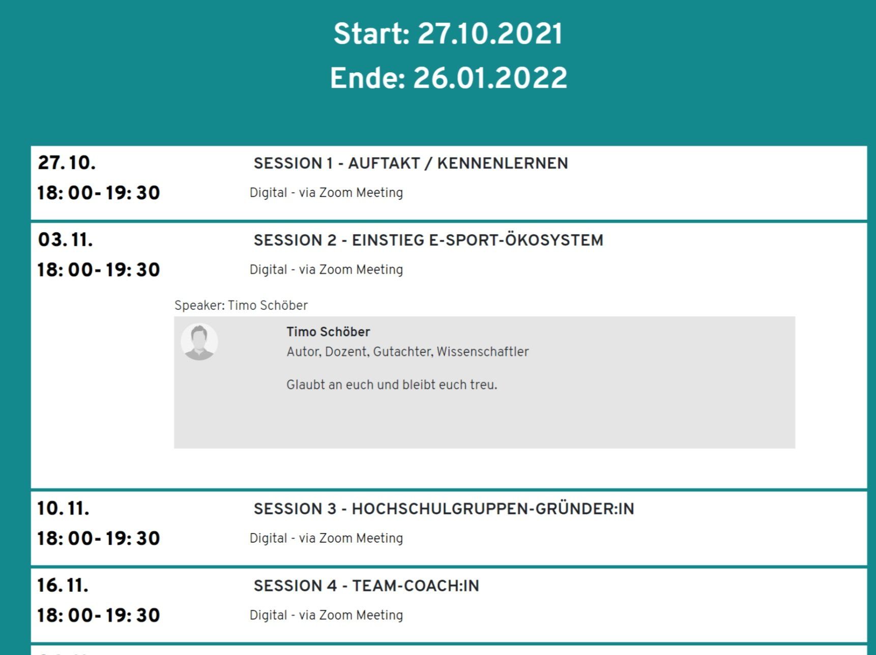 Offer of know-how transfer and speaker activities via zoom, teams, Skype and other media, here E-Sport Stammtisch, Zoom Meeting, 2020.