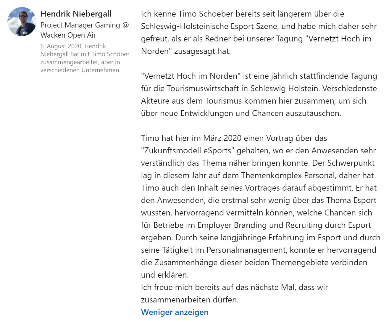 Discussions with various companies, organizations and people on special topics related to e-sports, in particular human resources, research and writing. Here, for example, with TERRITORY GmbH on the subject of e-sports and human resources work as part of a white paper.