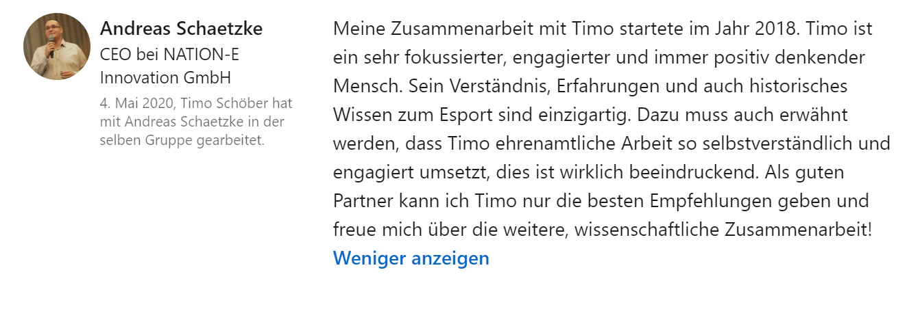 I expressly recommend anyone who wants to get involved in the e-sports market to deal with this situation and seek appropriate advice from a neutral (scientific) body. Even if e-sport offers many positive aspects, the economic system is unfortunately riddled with actors and actions in many places that would have no chance in less "bloated" sectors at a medium/high level.