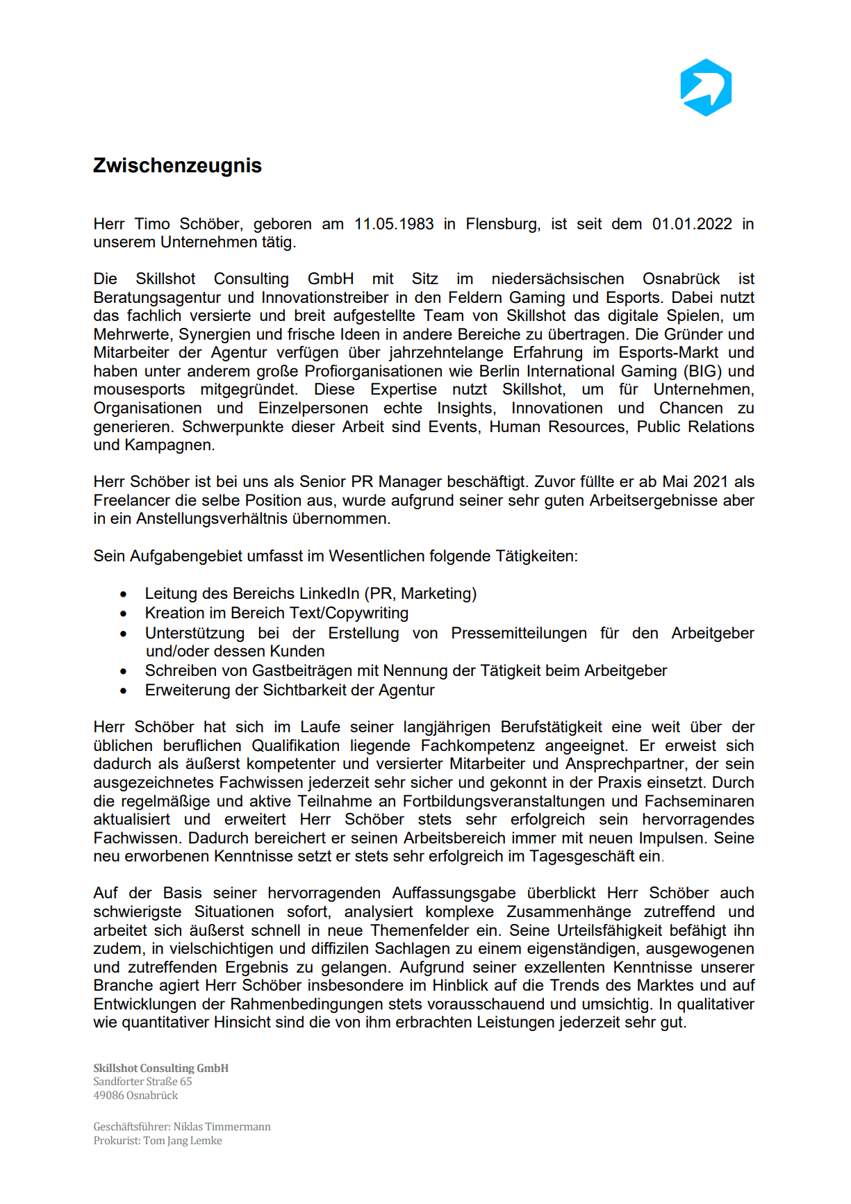 "أعرف Timo من خلال العمل معًا في مشاريع مختلفة ، لا سيما في مجال الرياضة الإلكترونية. من واقع خبرتي ، فإن معرفته المتخصصة هي من بين الأوائل في منطقة DA-CH. بالإضافة إلى ذلك ، فهو يجمع الموضوع مع جوانب أخرى ، مثل ككتابة وموارد بشرية. كان الاتصال البشري والشخصي وما زال ممتازًا ويعكس تعاونًا وديًا ومنفتحًا. "