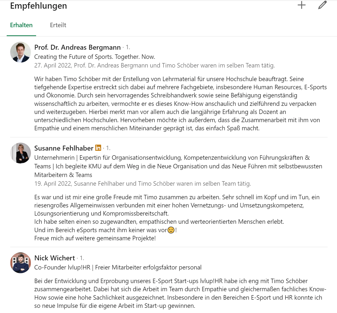 - Timo SchöberBorn 1983Abitur 2003Academic (best in major and minor in the diploma, summa cum laude in the doctorate)10 years of professional experience (HR), including 11 years as an employee in the HR Business Partner area of Krones AG including co-supervision of two subsidiaries and as HR Business partner of Stadtwerke FlensburgAuthor of 17 books, 9 of them on the subject of e-sportsCo-author of a further 8 e-sports booksAuthor of 2 textbooksAuthor/co-author of 10 scientific publicationsAuthor of 70 guest articlesExperience as a lecturer at four universities and one institute director of three areas of an institute at a university (HR, gameful design, e-sports) head of a think tank