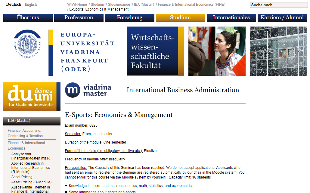 - European University Viadrina, Frankfurt (Oder)Master International Business AdministrationCourse: E-Sports: Economics & ManagementEnglish speaking