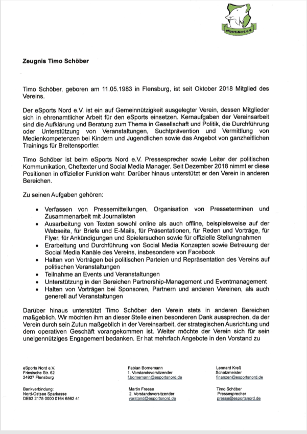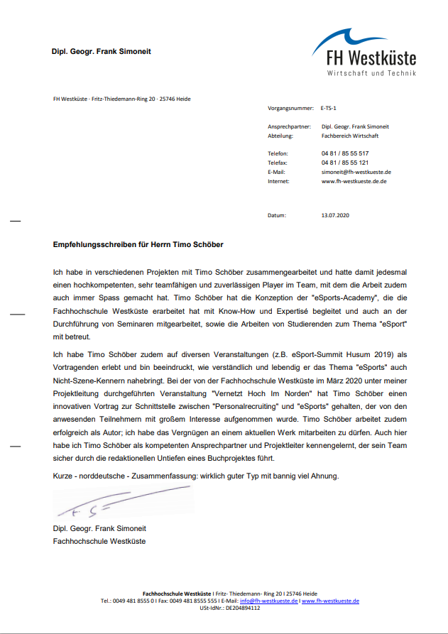 "Un colega muy valorado que siempre sabe cómo convencer con su manera abierta y competente. Siempre excelentemente preparado temática y profesionalmente y en la posición correcta en el campo de los recursos humanos. En el campo de los deportes electrónicos, el Sr. Schöber sabe cómo brillar a través de su trabajo académico y el correspondiente trabajo de investigación.”