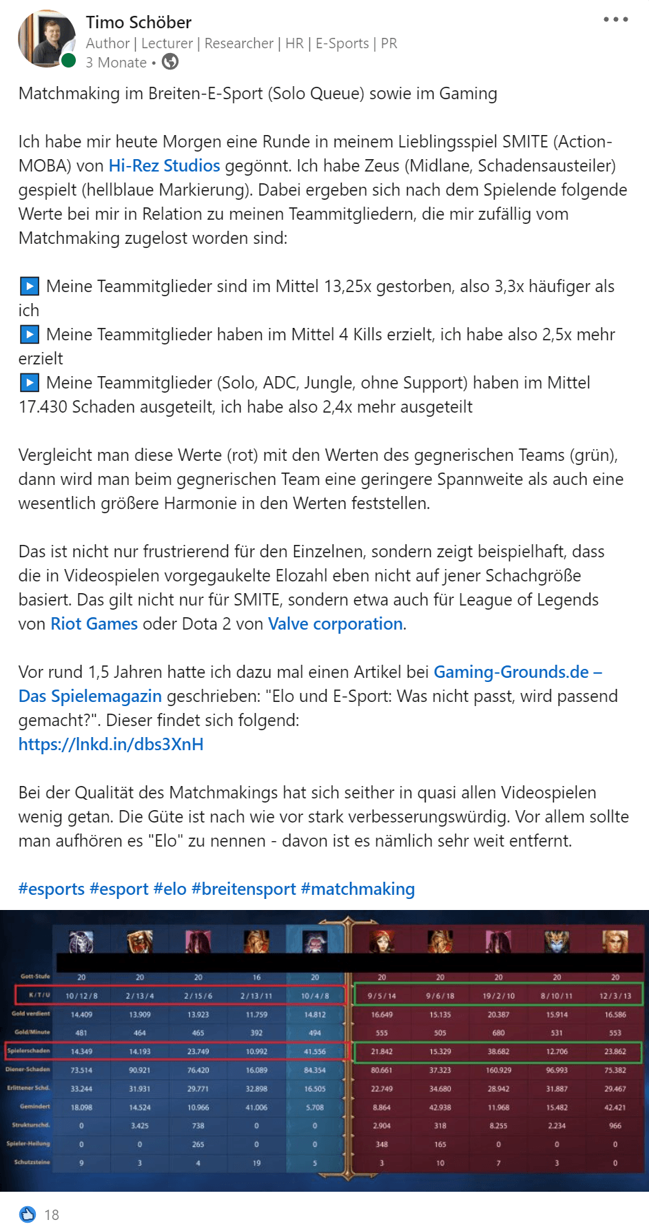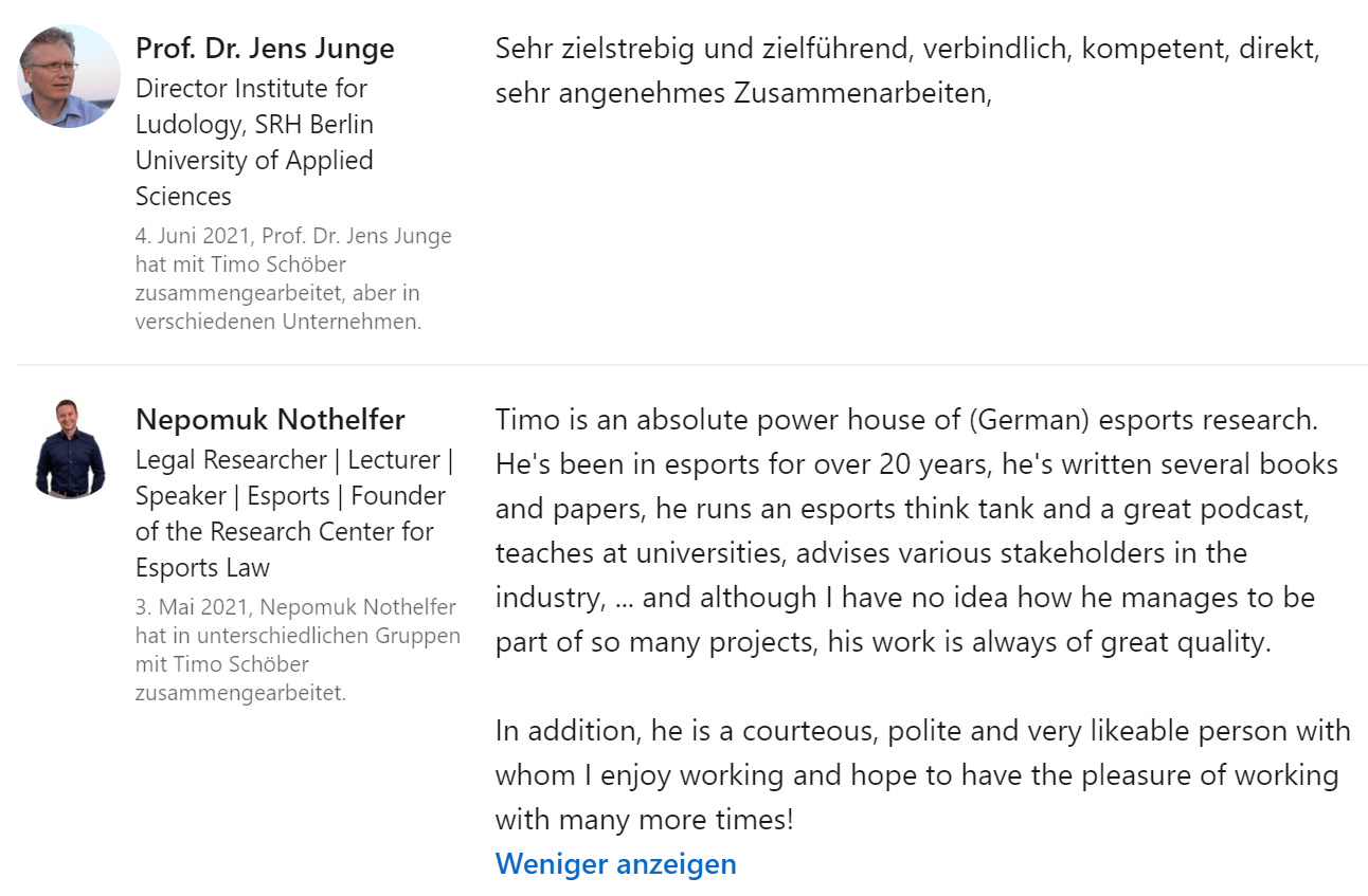 - Timo SchöberSünd 1983Abitur 2003Akadeemiline (parim peaerialal ja kõrvalerialal diplomis, summa cum laude doktorikraadis)10 aastat töökogemust (HR), sealhulgas 11 aastat töötajana Krones AG HR-äripartnerite alal, kaasa arvatud -kahe tütarettevõtte juhendamine ja Stadtwerke Flensburgi HR-äripartner 17 raamatu autor, neist 9 e-spordi teemal. Veel 8 e-spordiraamatu kaasautor 2 õpiku autor 10 teaduspublikatsiooni autor/kaasautor. 70 külalisartiklitKogemus õppejõuna neljas ülikoolis ja ühes instituudis ülikooli instituudi kolme valdkonna direktor (HR, mänguline disain, e-sport) mõttekoja juht
