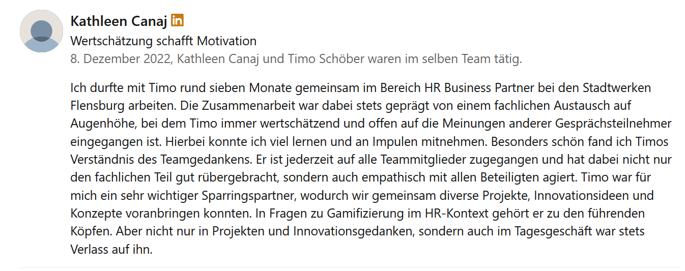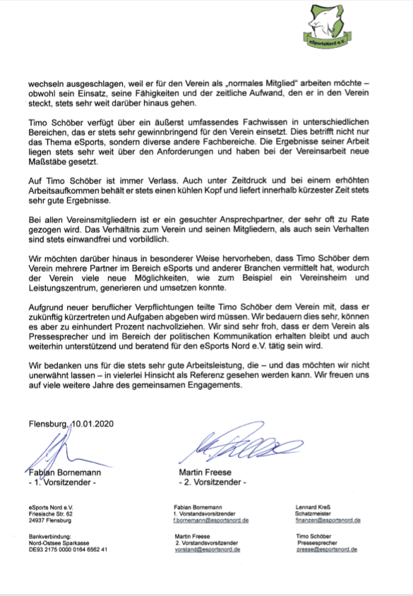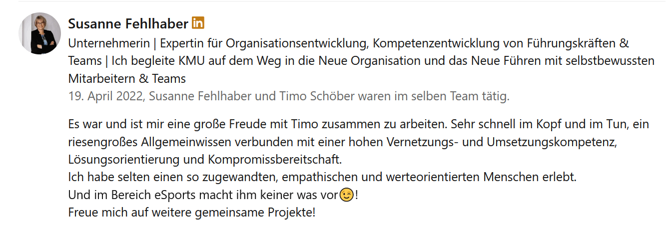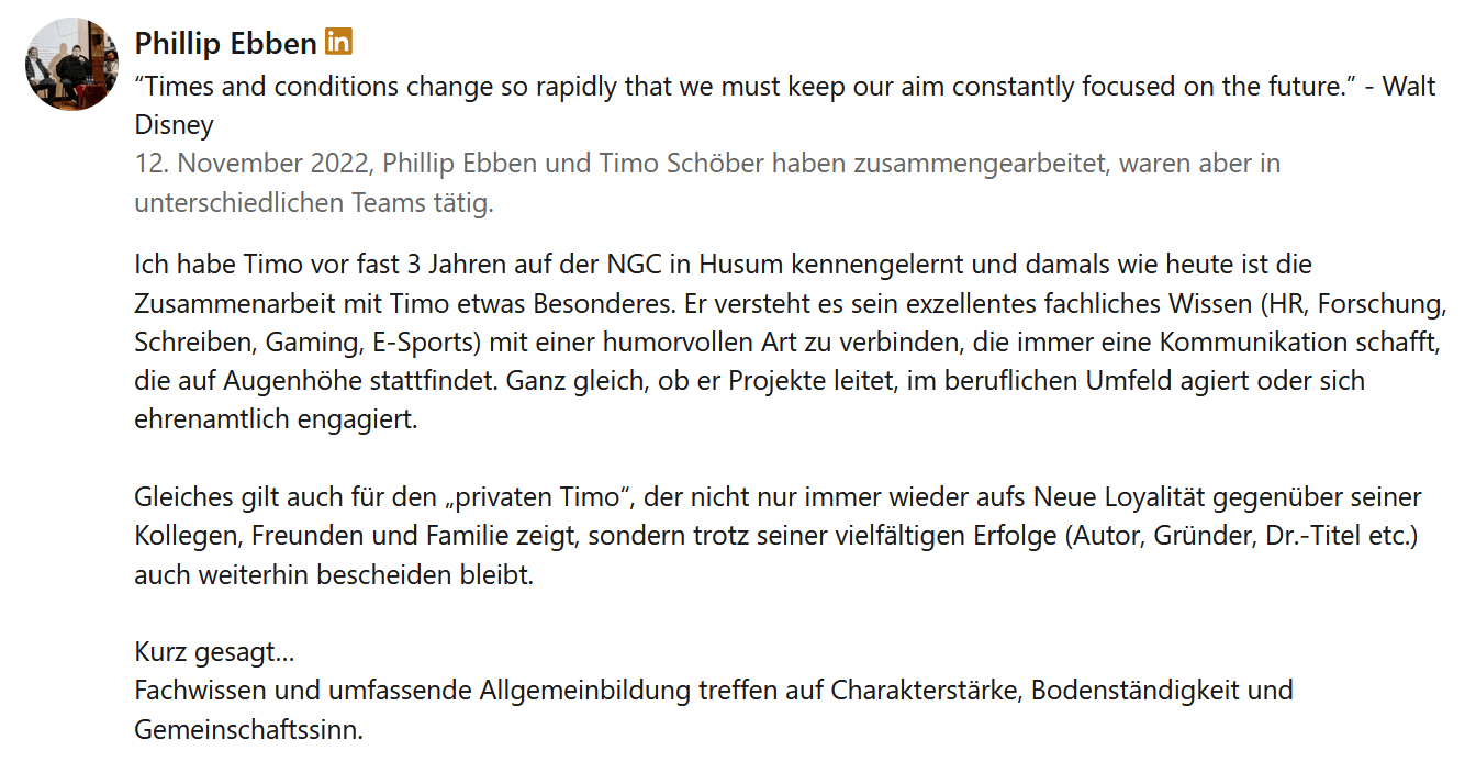 "Oleme Timoga juba koos töötanud mitmete e-spordiprojektide kallal ning olen alati leidnud, et ta on väga pädev ja abivalmis. Olgu siis üritustel esinejana sihtrühma ees väljastpoolt tööstust või konsultandina keerulised probleemkohad - Timo suutis alati anda uut sisendit ja sisu edastada seda arusaadaval viisil.Oma kirjandusega teeb ta teedrajavat tööd Saksamaa e-spordi areenil.Olen eelseisvate tööde pärast põnevil ja ootan põnevusega edaspidigi head koostööd!"