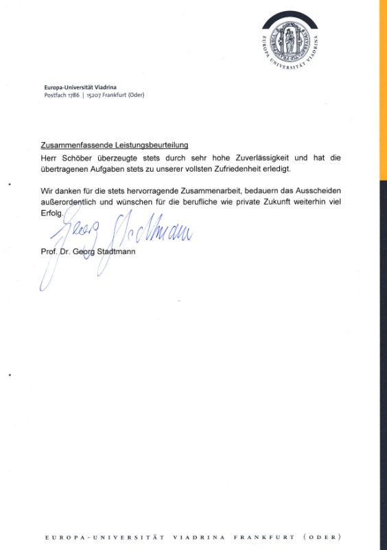 "Un collègue très apprécié qui sait toujours convaincre par sa manière ouverte et compétente. Toujours parfaitement préparé thématiquement et professionnellement et parfaitement positionné dans le domaine des RH. Dans le domaine de l'eSport, M. Schöber sait briller par son travail académique et les travaux de recherche correspondants. »