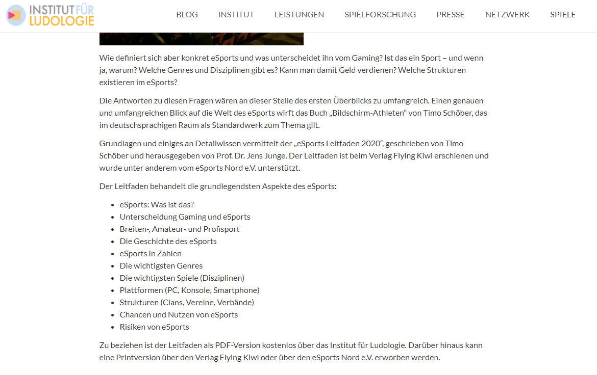 इन और कई अन्य सवालों पर किताब में चर्चा की गई है। ई-स्पोर्ट्स में पुराने हाथ भी निश्चित रूप से कुछ नया सीख सकते हैं। ईस्पोर्ट्स को एक वैश्विक कार्यक्रम के रूप में दिखाया जाएगा, जिसमें जर्मनी पर विशेष ध्यान दिया जाएगा। क्योंकि यह पुस्तक विशेष रूप से जर्मन भाषी लोगों के लिए ई-स्पोर्ट्स को सामाजिक फोकस में थोड़ा और आगे ले जाने के लिए बनाई गई थी। यह नए प्रकार का खेल न केवल इसके योग्य है, यह भविष्य में वैश्वीकृत और डिजीटल दुनिया में एक उत्कृष्ट भूमिका निभाएगा - एक ऐसा विकास जिसे अभी तक जर्मनी में पूरी तरह से मान्यता नहीं मिली है। यह किताब इसे बदलना चाहती है।
