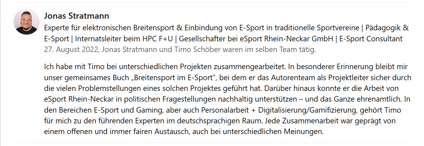 "Timo i ja smo već radili zajedno na nizu e-sport projekata i uvijek sam ga smatrao vrlo kompetentnim i korisnim. Bilo kao govornik na događajima pred ciljnom skupinom izvan industrije ili kao konzultant u složena problematična područja - Timo je uvijek bio u mogućnosti dati nove informacije, a sadržaj ih je prenio na razumljiv način. Svojom literaturom obavlja pionirski posao za njemačku scenu e-sporta. Uzbuđen sam zbog nadolazećih radova i veselim se i dalje dobra suradnja!"