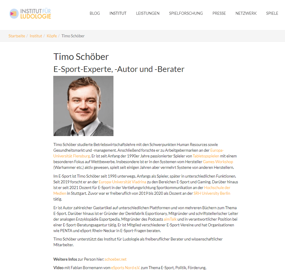 ਨਵੰਬਰ 2021 ਤੋਂ ਮੈਂ ਇੰਸਟੀਚਿਊਟ ਫਾਰ ਲੁਡੋਲੋਜੀ ਵਿੱਚ ਈ-ਸਪੋਰਟਸ ਵਿਭਾਗ ਲਈ ਜ਼ਿੰਮੇਵਾਰ ਹਾਂ, ਇੱਕ ਮਾਹਰ ਦੇ ਤੌਰ 'ਤੇ ਲੰਬੇ ਸਮੇਂ ਤੱਕ ਉੱਥੇ ਕੰਮ ਕਰਨ ਤੋਂ ਬਾਅਦ। ਸੰਸਥਾ ਖੇਡ-ਸਿਧਾਂਤਕ, ਇਤਿਹਾਸਕ ਅਤੇ ਖੇਡ-ਵਿਗਿਆਨਕ ਸਮੱਗਰੀ ਨਾਲ ਨਜਿੱਠਦੀ ਹੈ।
