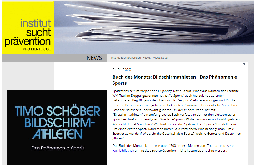 "เนื่องจากประสบการณ์หลายปีของเขาในด้านอีสปอร์ตและด้านวิทยาศาสตร์ รวมถึงผลงานตีพิมพ์ก่อนหน้านี้ เช่น "คัดนักกีฬา - ปรากฏการณ์ของอีสปอร์ต" เขาจึงนำความสามารถอันยอดเยี่ยมในเรื่องนี้มาด้วย ซึ่ง เขาใช้การเปรียบเทียบอย่างชาญฉลาดและการปรับบริบทให้เข้ากับเหตุการณ์และการพัฒนาในปัจจุบัน"