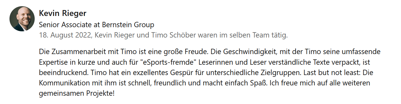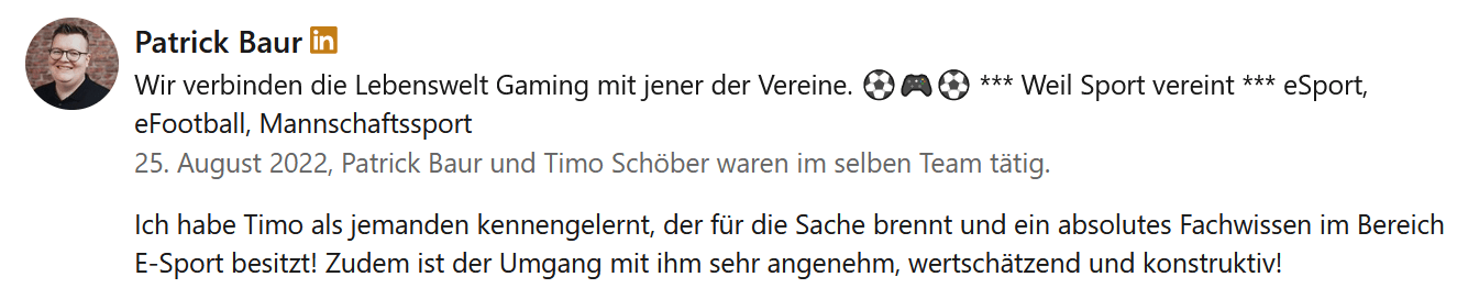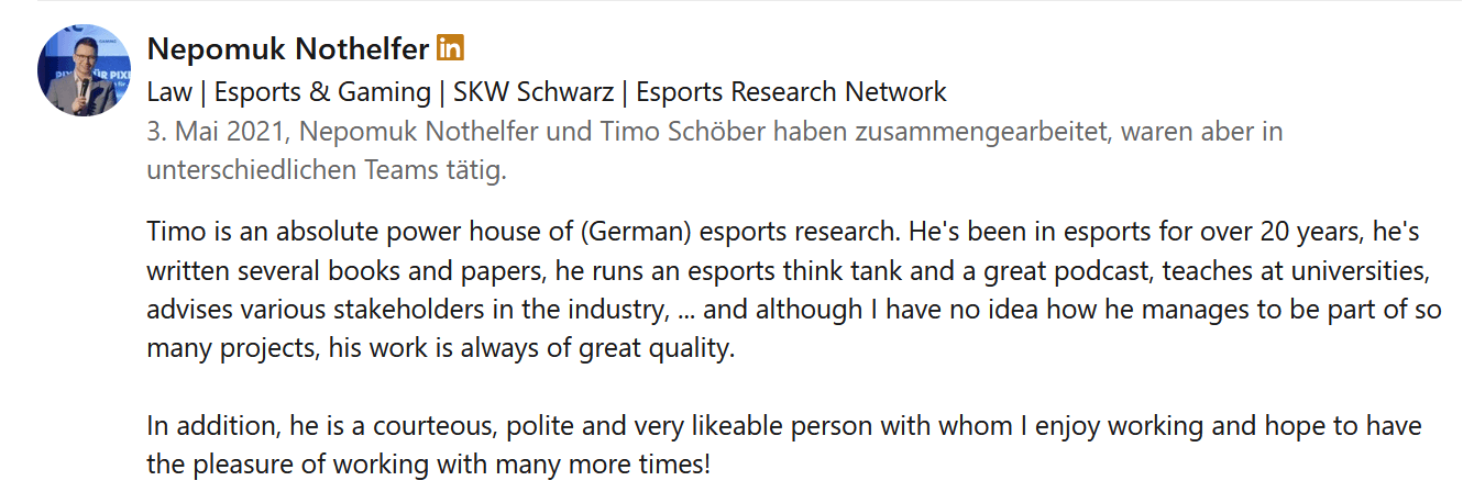 "Ich kenne Timo durch die Zusammenarbeit bei unterschiedlichen Projekten, insbesondere im Bereich E-Sport. Seine Fachkenntnisse zählen im D-A-CH-Raum nach meiner Erfahrung zum Spitzenbereich. Darüber hinaus verbindet er das Thema sinnvoll mit anderen Aspekten, beispielsweise dem Schreiben und dem Personalwesen. Menschlich und persönlich war und ist der Umgang immer ausgezeichnet und spiegelt ein freundschaftliches